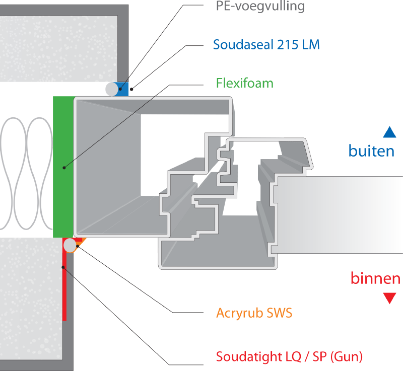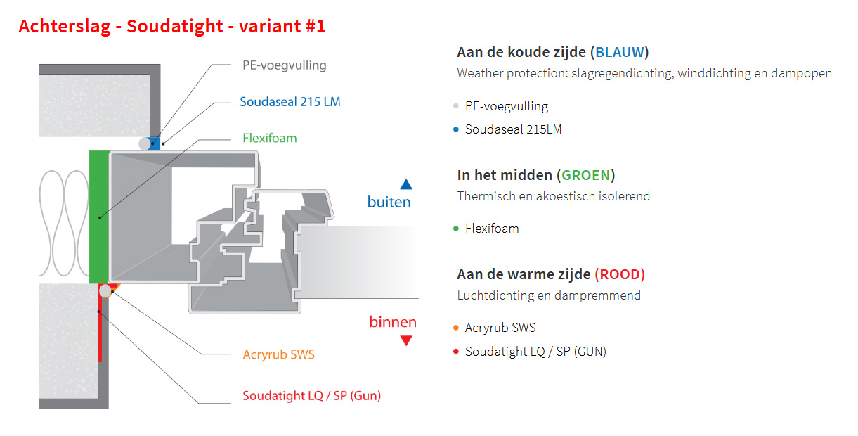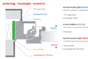 The different products can be perfectly combined per level for any installation method. For example, the SWS Vario Extra is used on the outside, Flexifoam in the middle, while the inside is finished with Soudatight SP.